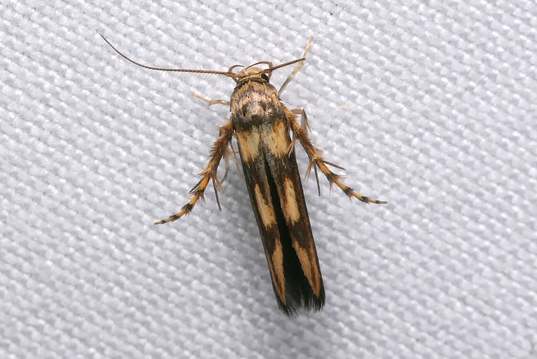 胸部前方に弓状の黄色い線が2本。前翅の1/3ぐらいから翅頂ぐらいまで前縁付近に黄色の線が途切れず伸びる。画像の個体で前翅長6mm。
